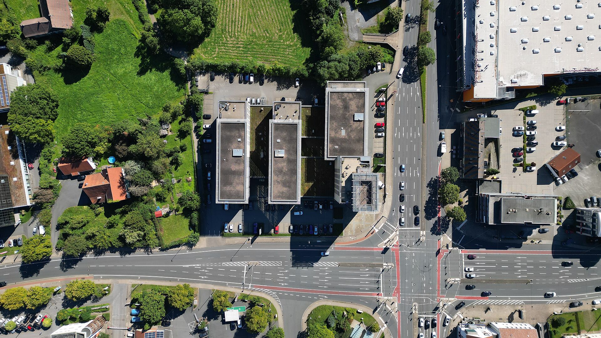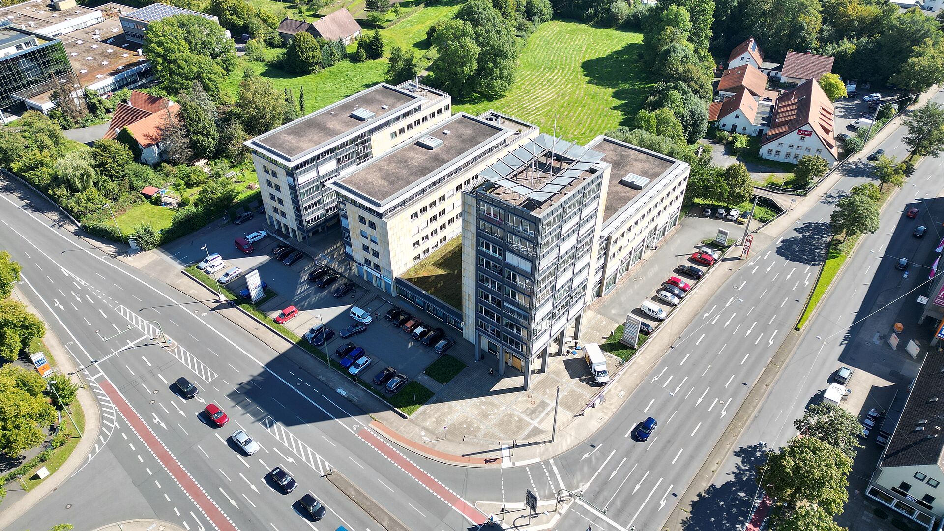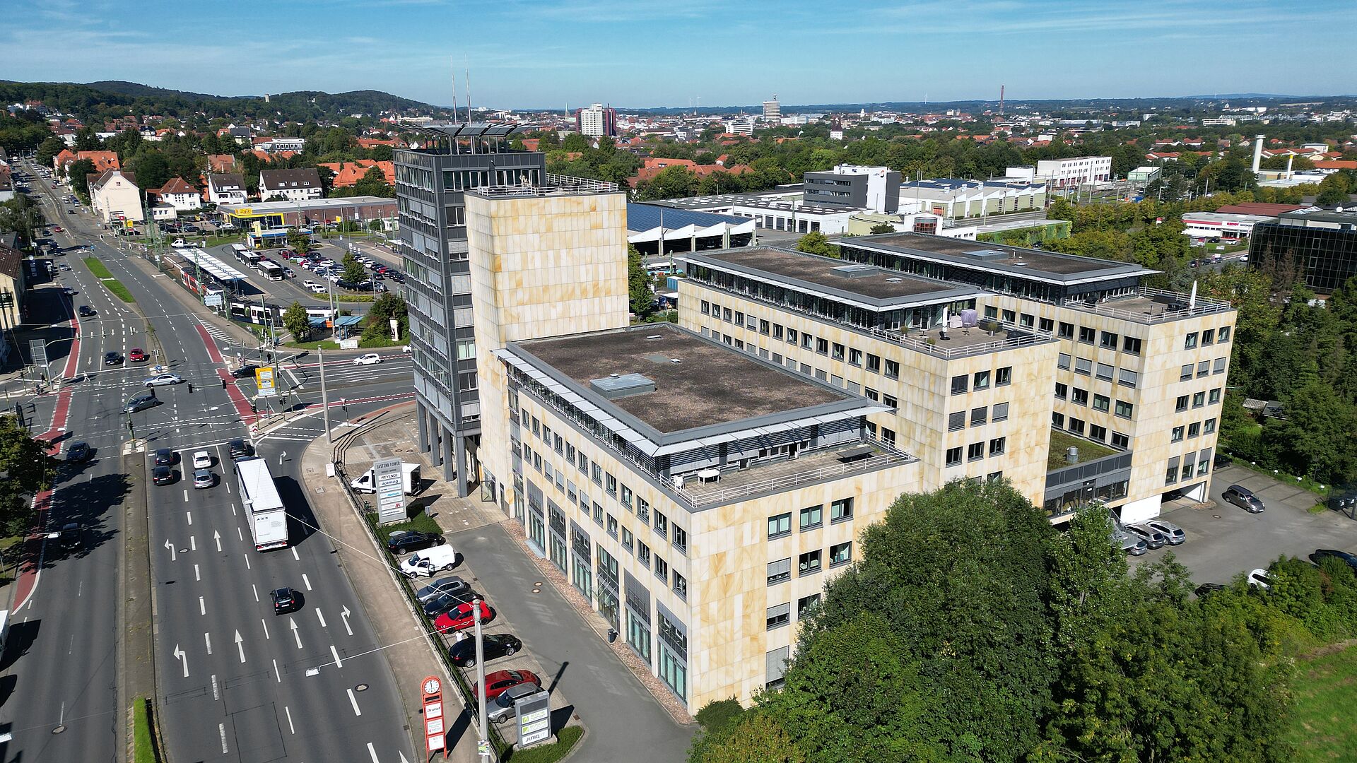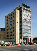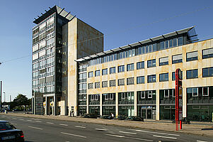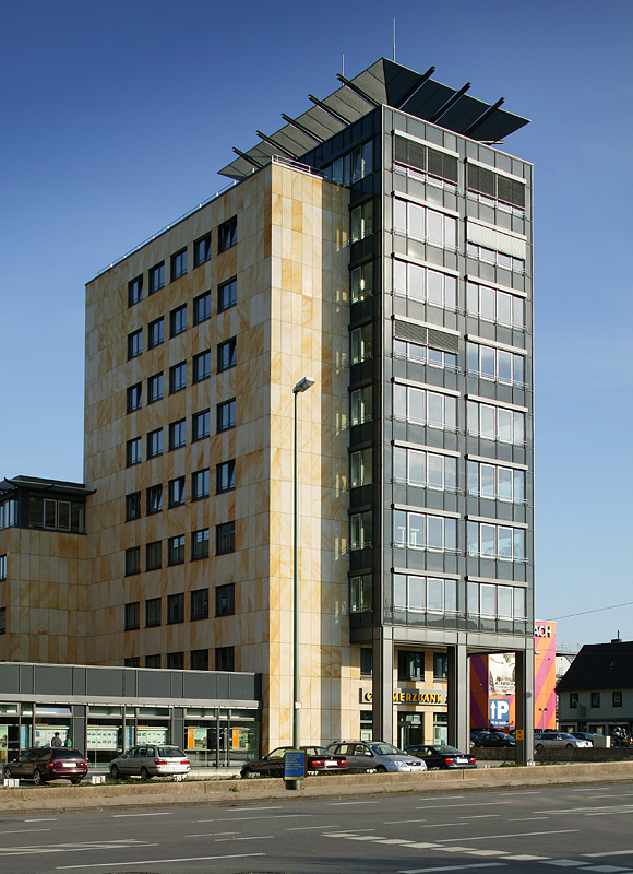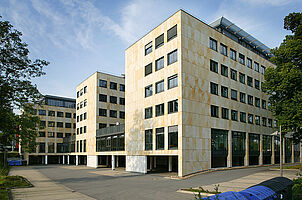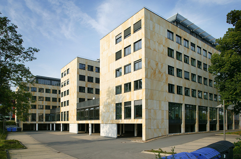 Das Gebäudeensemble besteht aus 3 Bauteilen die unter- und erdgeschossig miteinander verbunden sind. Die Fassade besticht durch ihren Kontrast aus mattem Sandstein und silberstrukturierten Glasflächen.