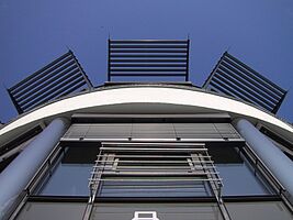 Der als städtebauliches Landmark geplante 3-geschossige radiale Turm wird im Staffelgeschoss als dreiteilbarer Konferenz- und Vortragsraum genutzt. Im Erdgeschoss befindet sich ein Café mit Konditorei sowie ein EDV-Ladenlokal.