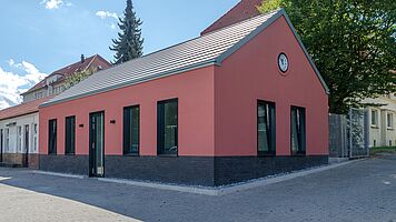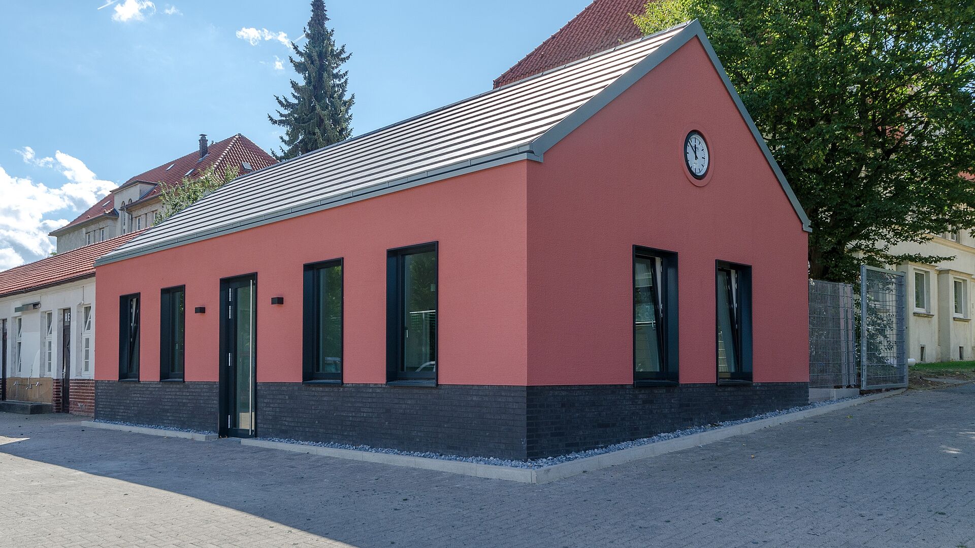 Das Gebäude übernimmt die Grundkubatur der aus den 1920er Jahren entstandenen Umkleidegebäude, welche mit Sprossenfenster und Gesimsen an der Fassade verziert sind. Auf einer Nutzfläche von ca. 60qm sind im Neubau ein Sekretariat und ein Schulungsraum untergebracht.