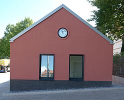 Das Gebäude setzt sich in seiner Anmutung mit Klinkersockel in Anthrazit und der Fassadefarbe in der Farbmischung in Anlehnung an den ehemaligen Ascheplatz in „Ascherot“ deutlich ab. Somit wird auch die Büronutzung unterstrichen.