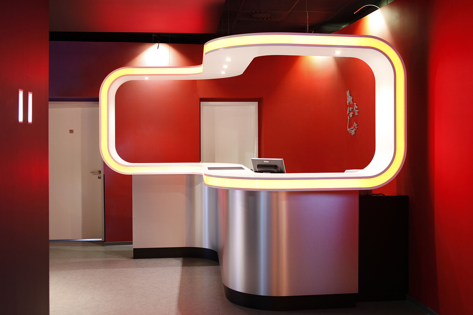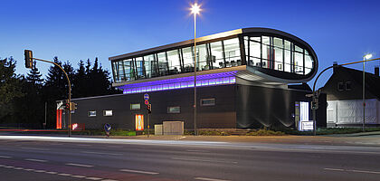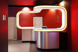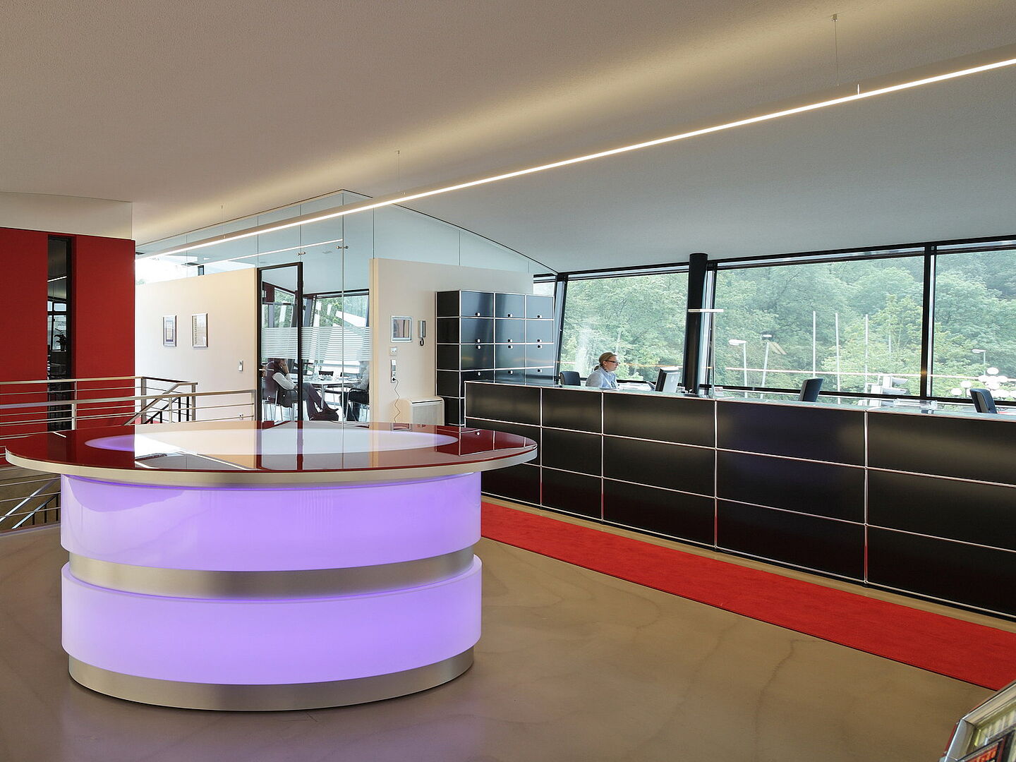 Der im Erdgeschoss beinhaltet eine Werkstatt und Showrooms. Die durch eine umlaufende Lichtfuge schwebende, elliptische Stahlkonstruktion bildet das Büro der Geschäftsführung mit Besprechnungsräumen und Sekretariaten.