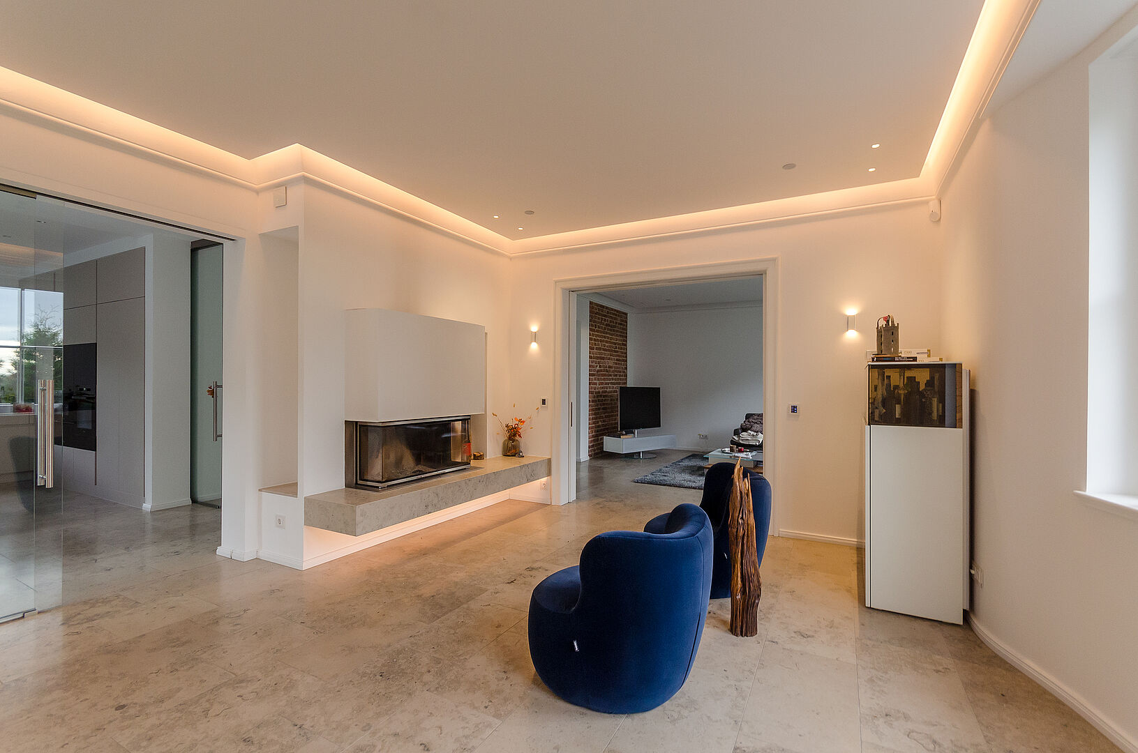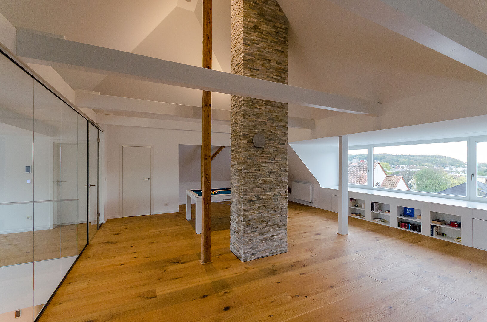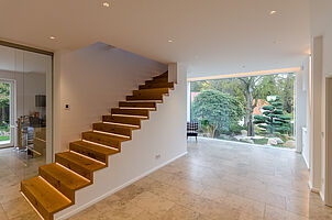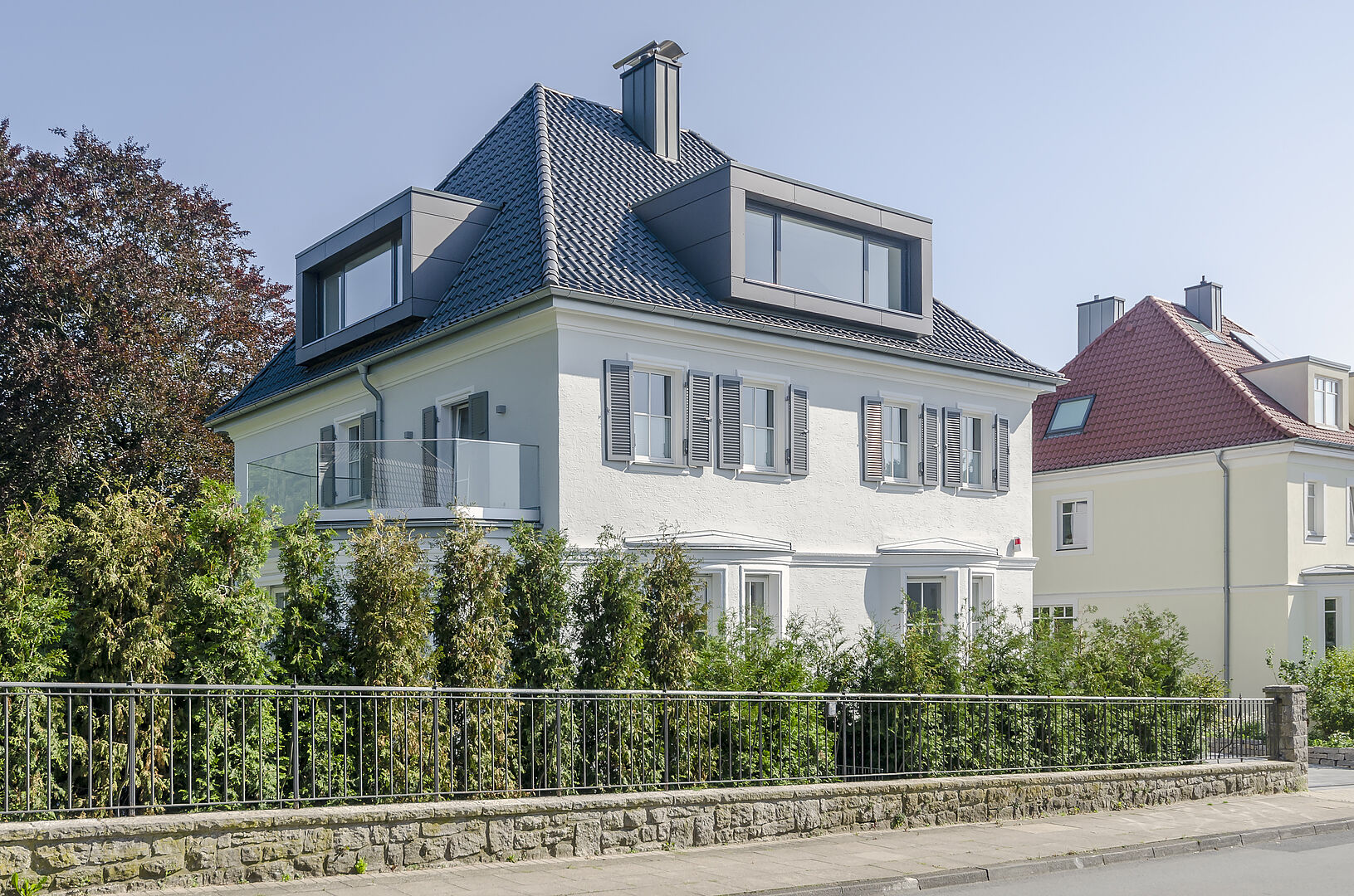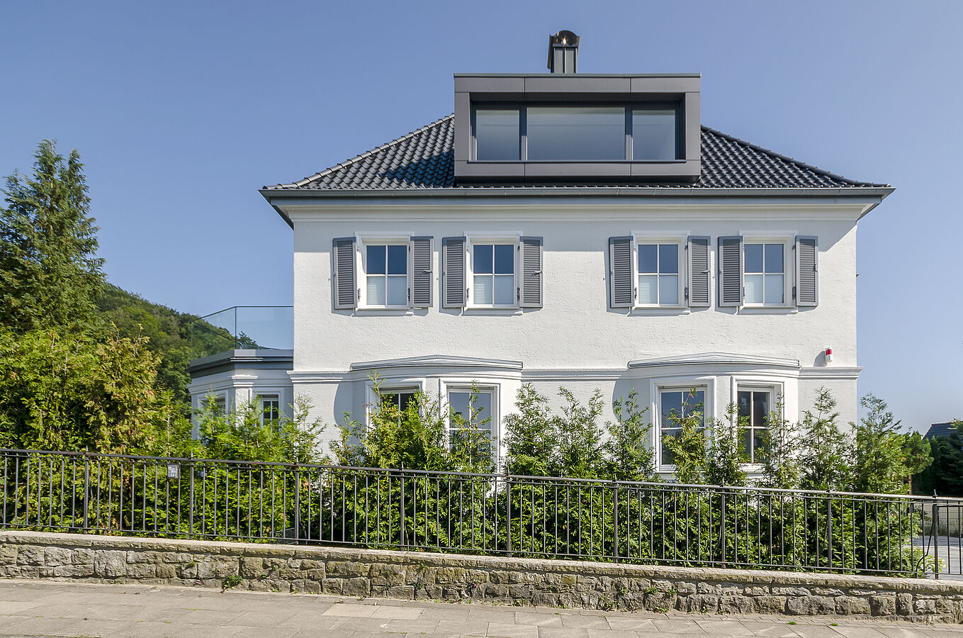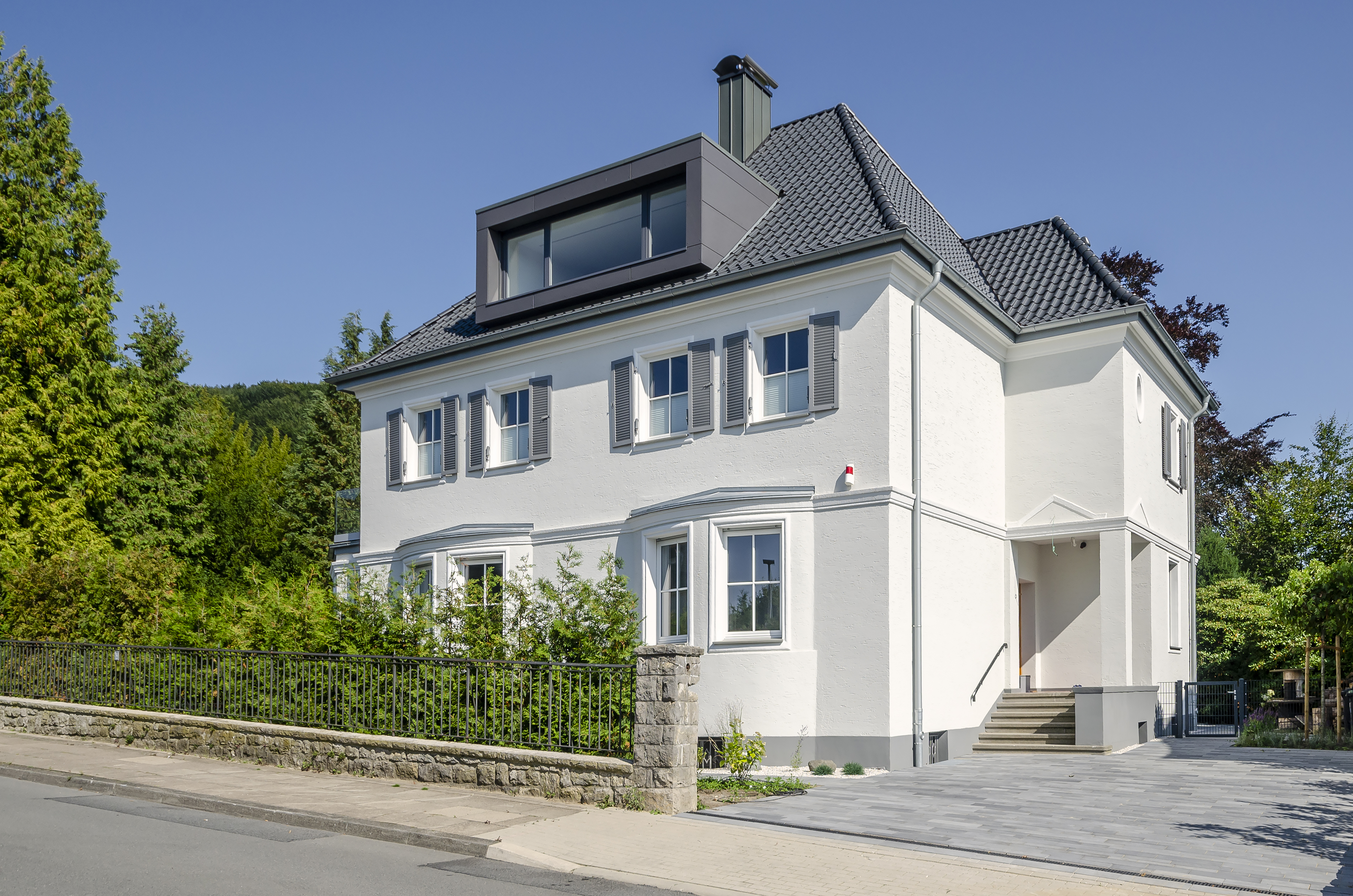 Das 1924 erbaute Einfamilienhaus mit Villencharakter wurde 2018 vom Eigentümer erworben. Der bauliche Zustand war annähernd noch Original und insoweit in vielen Details abgängig. Der Umbau der Geschosse nebst starker Entkernungsmaßnahmen erfolgte 2018/ 2019. Der nun loftige Dachgeschossausbau wurde mittels einer neu integrierten offenen Treppenanlage, welche alle Ebenen transparent miteinander verbindet, in die Wohnflächen mit einbezogen. Das Dachgeschoss erhielt Liegeflächen in den Dachgauben, welche nicht nur die Ausblicke auf den botanischen Garten, sondern auch auf die Sparrenburg und den Bielefelder-Pass erlauben. Zudem sind sie gestaltungsbildend und prägen nun den modernen Ausdruck des ansonsten fast ursprünglich erhaltenden Gebäudes. Selbst die abgängige historische individuelle Haustüre wurde im Original nachgebaut.