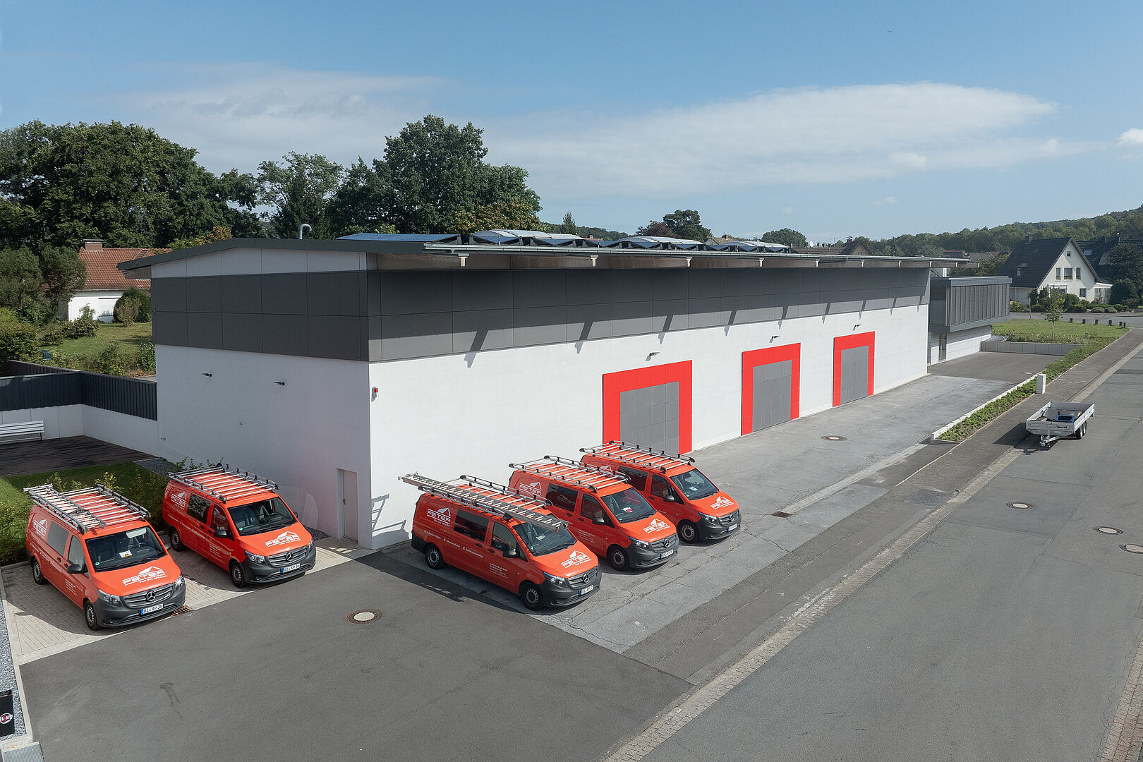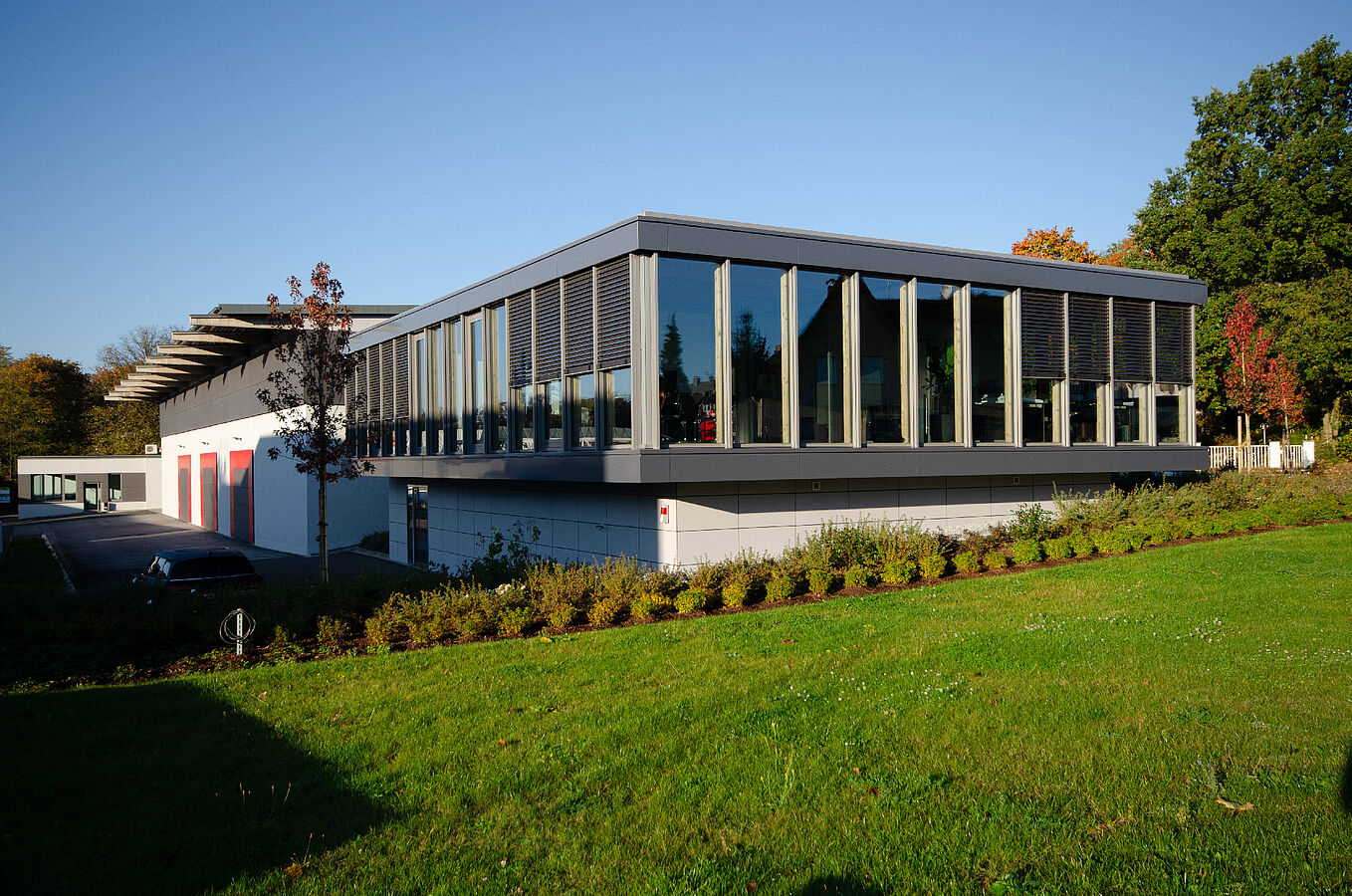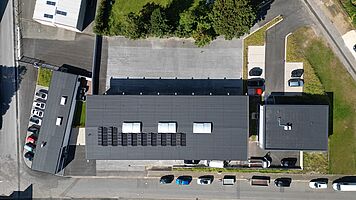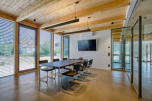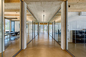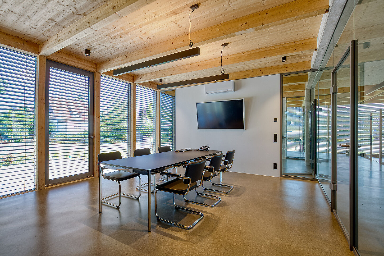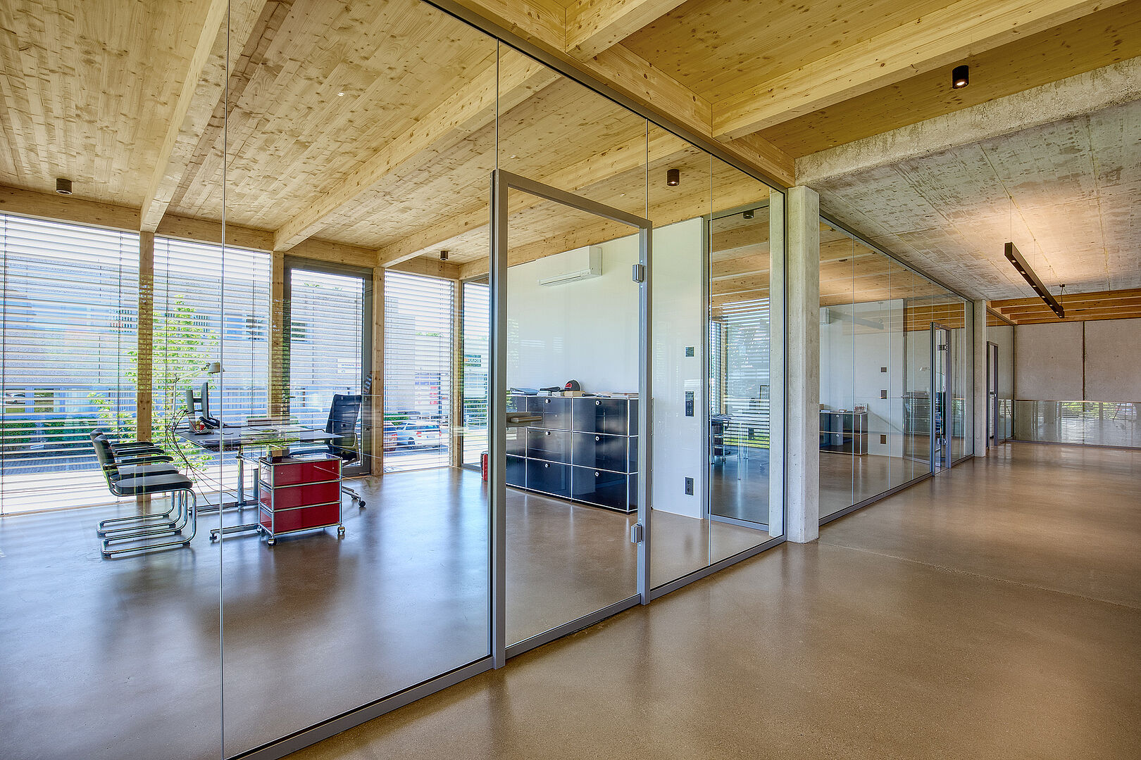 Ein als Blickfang entworfenes vierseitig verglastes Bürogebäude - als Entree für das gesamte Areal - wurde in Hybridbauweise mit unbekleideter Holzkonstruktion sowie sichtbaren Betonoberflächen entwickelt. Die seit 1904 bestehende Handwerkskunst des 50 Mitarbeiter starken Dachdecker- und Zimmerbetriebs sollte hier besonders zur Geltung kommen. Die Verbindungen, das Detail wurde sorgfältig in gemeinsamer Abstimmung geplant und erarbeitet. Die Arbeiten mussten sehr präzise durchgeführt werden.