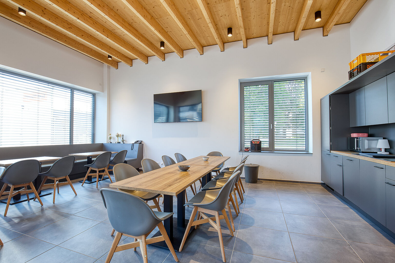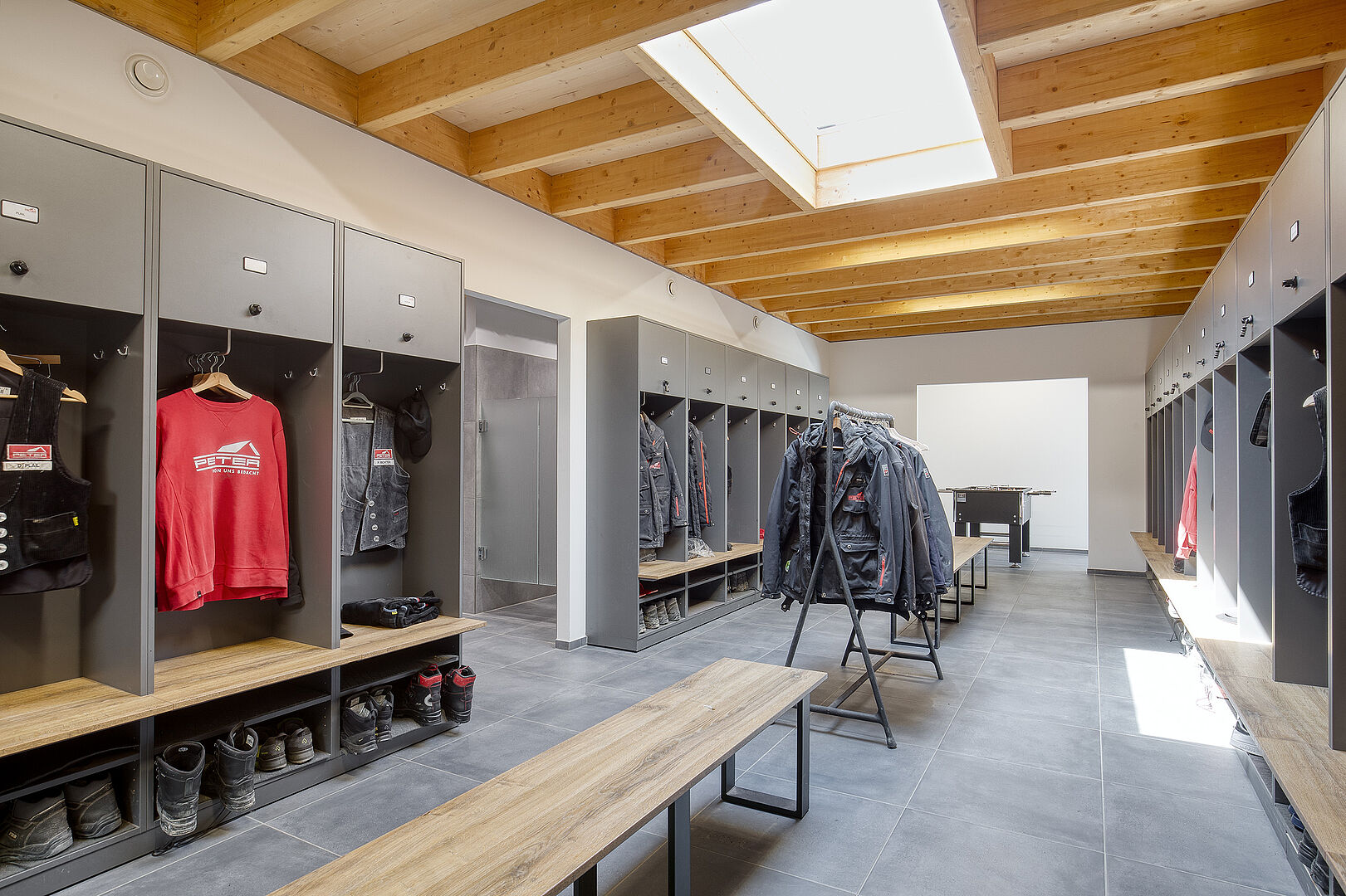 Zum einen wurde der ehemalige freistehende Ausstellungs- und Bürotrakt für die Mitarbeiter in Sozialräume umgenutzt. In Anlehnung an eine „Fußball-Bundesliga Mannschaft“ wurden die Umkleiden, auch für Frauen separat, gestaltet.