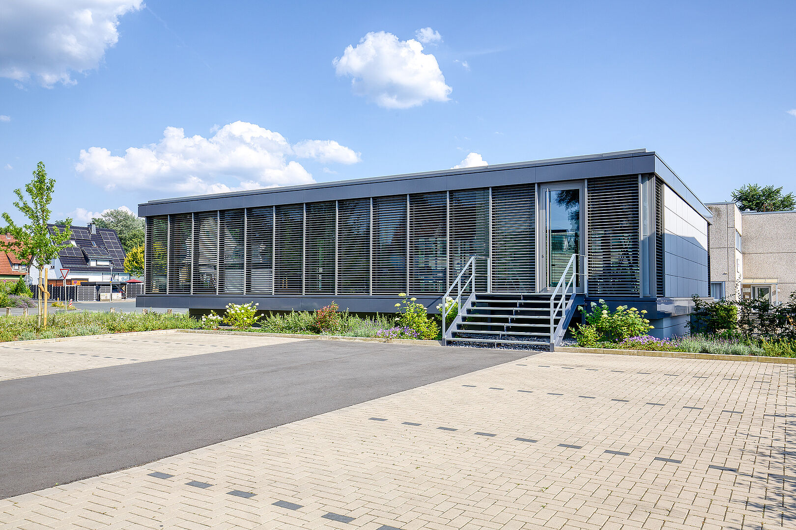 Dieses feine und relativ kleine Bürogebäude löst mit seiner passenden Positionierung und Höhenlage die ursprüngliche Dominanz der ehemaligen Baustoff-Lagerhalle auf und tritt somit in den Vordergrund.