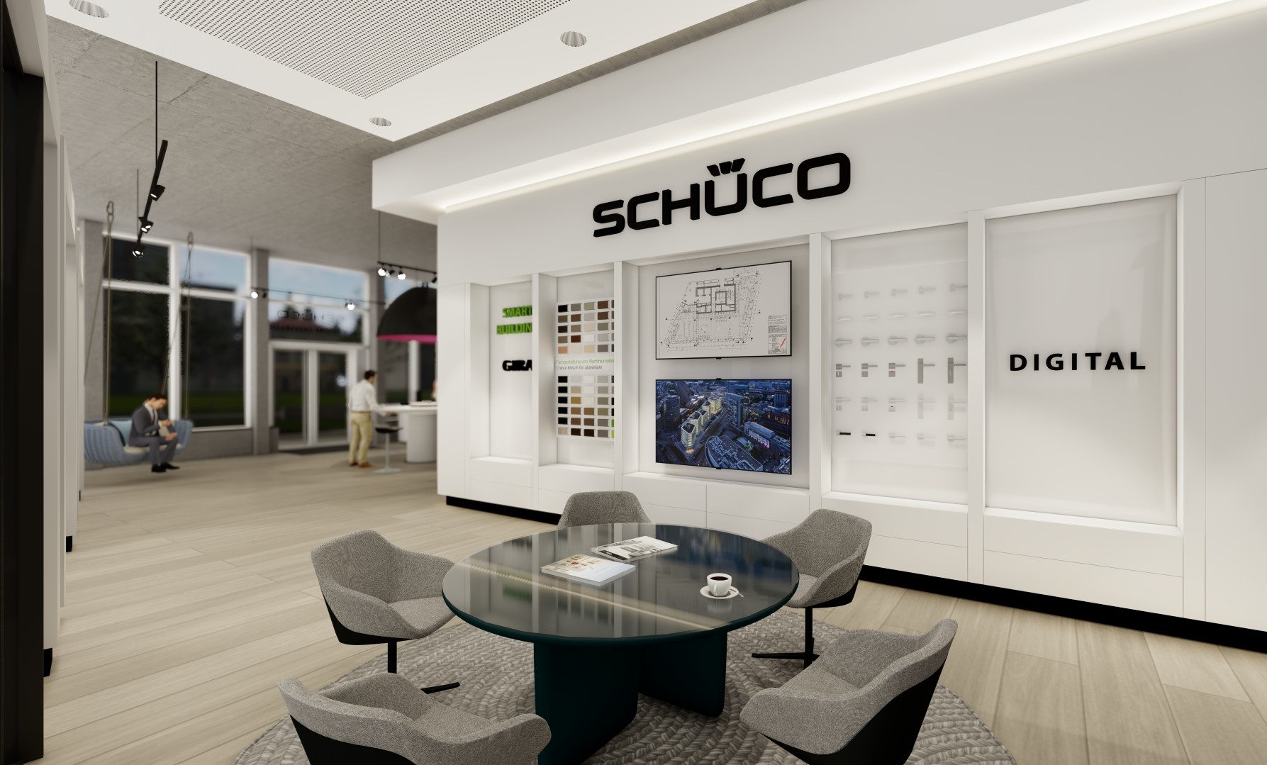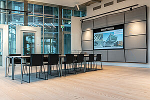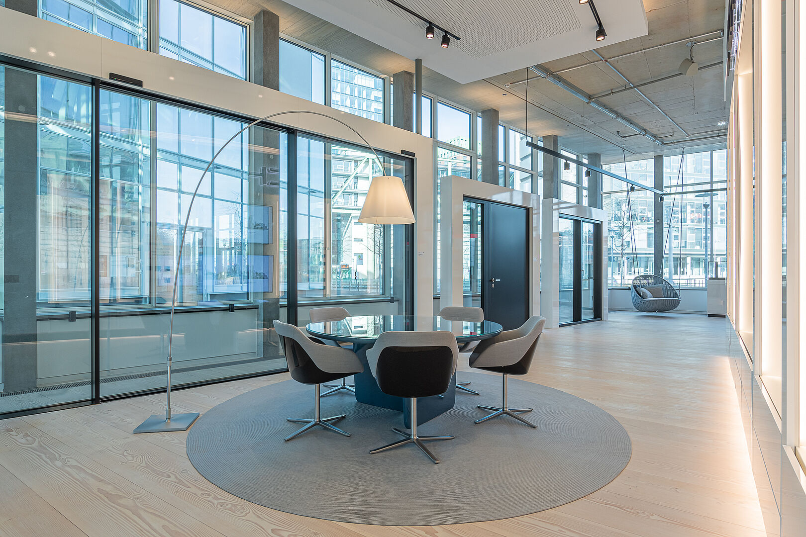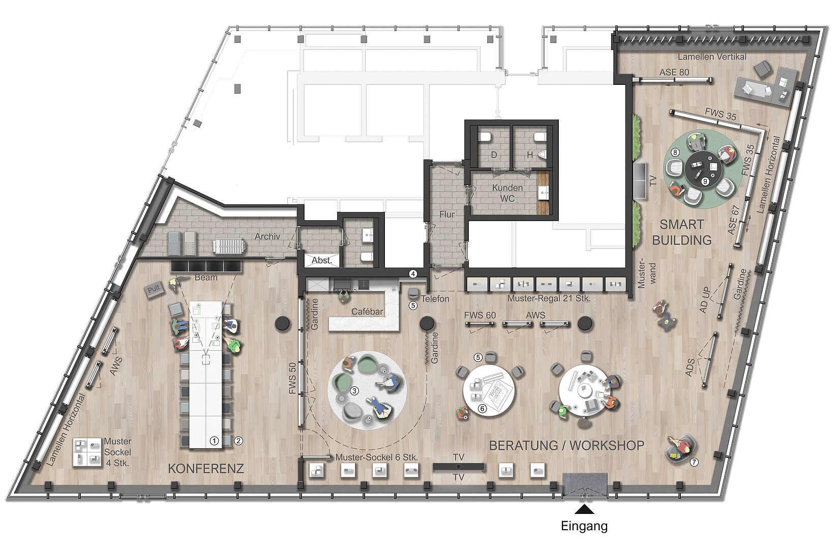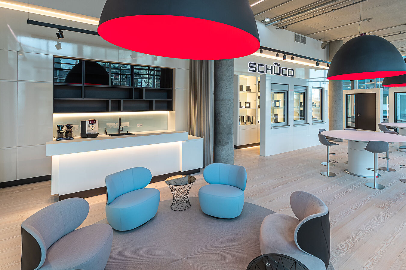 Für eine im Erdgeschoss gelegene unausgebaute 400qm umfassende Retailfläche des vom Stararchitekten Renzo Piano geplanten und im Jahre 2020 fertiggestellten Float-Buildings, wurde von der Fa. Schüco ein beschränkter Ideen Wettbewerb ausgelobt. Nach einer Überarbeitungsrunde entschieden sich die Bauherren für den Entwurf von Stopfel Architekten BDA. Der Leistungsumfang wurde vom Entwurf bis zur Fertigstellung, dazu Mitwirken an kleinsten Details, über die Planung der Exponate bis hin zu den Dekorationen/ Ausstattung beauftragt. Konferenz, Schulung, Beratung, getrennt oder auch miteinander verbunden, sollte möglich werden. Diverse Funktionen (z.B. über Raumtrennungen) und Szenen (z.B. über Lichtansteuerungen, Akustik, Medien) sollten im Tag- und Nachtbetrieb möglich sein. Offen verlegte sichtbare Technik, zweigeschossige Raumhöhen und bis zu 6 Meter lange Douglasie-Dielen schaffen gewollte Großzügigkeit und genügend Betrachtungsraum für die Vorstellung der modernsten Schüco Fenster-, Tür- und Fassaden-Exponate. Die Fertigstellung des Showrooms erfolgte im Oktober 2021.