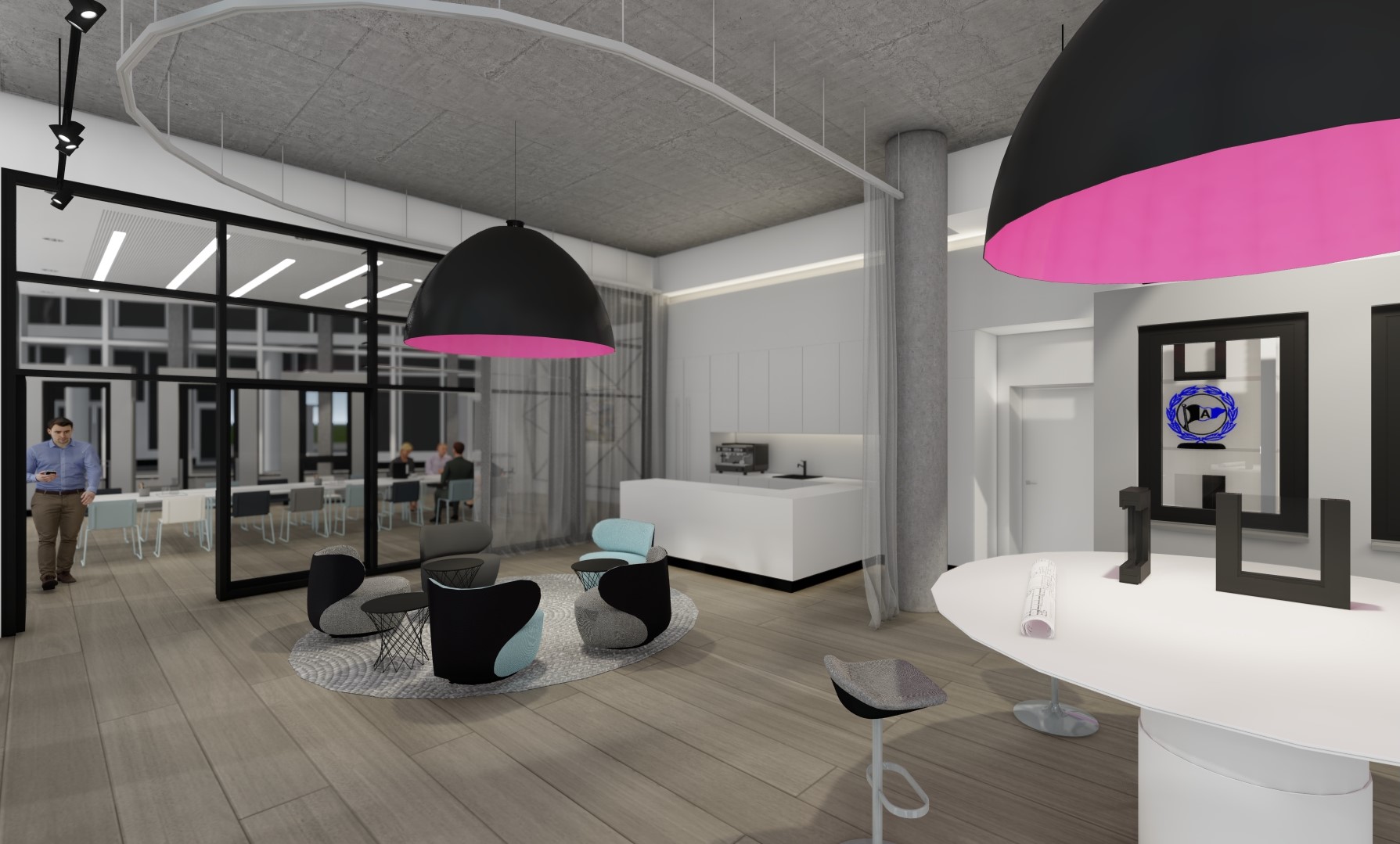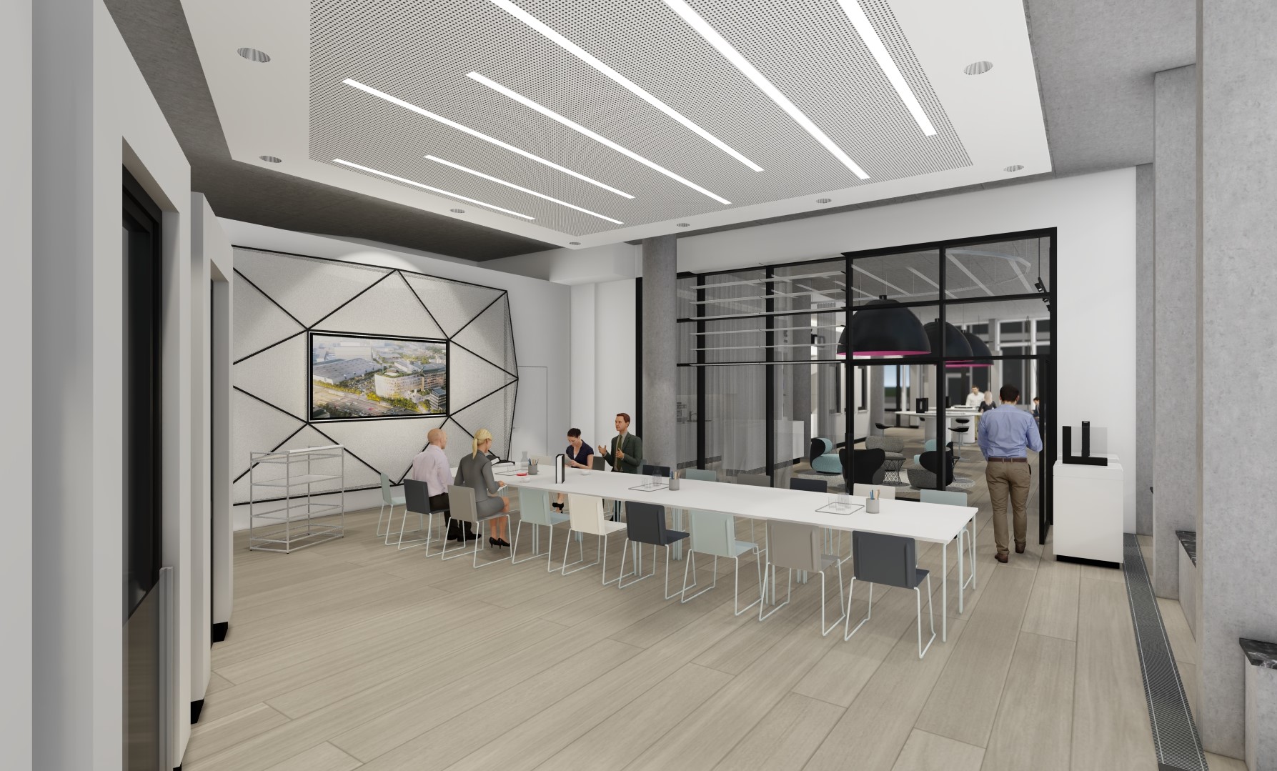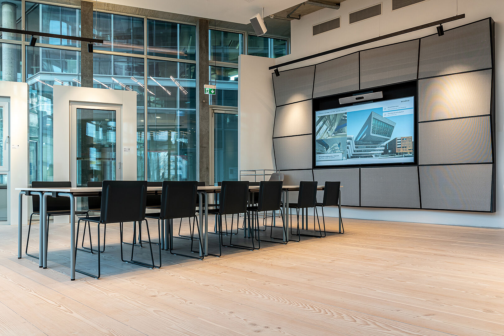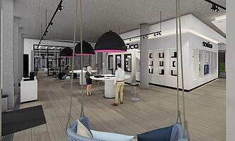 Für eine im Erdgeschoss gelegene unausgebaute 400qm umfassende Retailfläche des vom Stararchitekten Renzo Piano geplanten und im Jahre 2020 fertiggestellten Float-Buildings, wurde von der Fa. Schüco ein beschränkter Ideen Wettbewerb ausgelobt. Nach einer Überarbeitungsrunde entschieden sich die Bauherren für den Entwurf von Stopfel Architekten BDA. Der Leistungsumfang wurde vom Entwurf bis zur Fertigstellung, dazu Mitwirken an kleinsten Details, über die Planung der Exponate bis hin zu den Dekorationen/ Ausstattung beauftragt. Konferenz, Schulung, Beratung, getrennt oder auch miteinander verbunden, sollte möglich werden. Diverse Funktionen (z.B. über Raumtrennungen) und Szenen (z.B. über Lichtansteuerungen, Akustik, Medien) sollten im Tag- und Nachtbetrieb möglich sein. Offen verlegte sichtbare Technik, zweigeschossige Raumhöhen und bis zu 6 Meter lange Douglasie-Dielen schaffen gewollte Großzügigkeit und genügend Betrachtungsraum für die Vorstellung der modernsten Schüco Fenster-, Tür- und Fassaden-Exponate. Die Fertigstellung des Showrooms erfolgte im Oktober 2021.