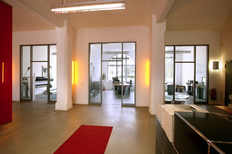 Die Büros im Fabrik-/Loft-Charakter erhalten ihren Charme durch die freigestellte Stützkonstruktion sowie Großzügigkeit durch Raumhöhe und große Fenster.