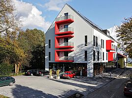 Das barrierefreie Gebäude überzeugt zudem durch Niedrigenergiebauweise (KFW 60) und eine Photovoltaikanlage (15.000 kW/Jahr) sowie seinem optimiertem Verhältnis von Außenhülle und Volumen.